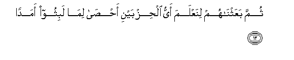 12. Thumma baAAathnahum linaAAlama ayyu alhizbayni ahsa lima labithoo amadan