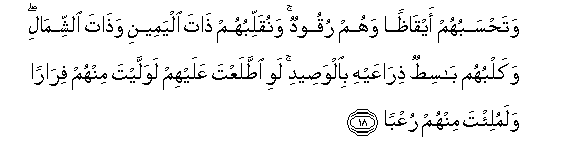 18. Watahsabuhum ayqathan wahum ruqoodun wanuqallibuhum thata alyameeni wathata alshshimali wakalbuhum basitun thiraAAayhi bialwaseedi lawi ittalaAAta AAalayhim lawallayta minhum firaran walamuli/ta minhum ruAAban