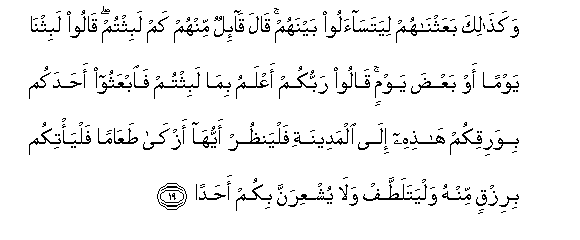 19. Wakathalika baAAathnahum liyatasaaloo baynahum qala qa-ilun minhum kam labithtum qaloo labithna yawman aw baAAda yawmin qaloo rabbukum aAAlamu bima labithtum faibAAathoo ahadakum biwariqikum hathihi ila almadeenati falyanthur ayyuha azka taAAaman falya/tikum birizqin minhu walyatalattaf wala yushAAiranna bikum ahadan