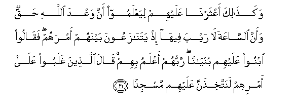21. Wakathalika aAAtharna AAalayhim liyaAAlamoo anna waAAda Allahi haqqun waanna alsaAAata la rayba feeha ith yatanazaAAoona baynahum amrahum faqaloo ibnoo AAalayhim bunyanan rabbuhum aAAlamu bihim qala allatheena ghalaboo AAala amrihim lanattakhithanna AAalayhim masjidan