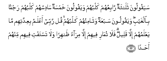 22. Sayaqooloona thalathatun rabiAAuhum kalbuhum wayaqooloona khamsatun sadisuhum kalbuhum rajman bialghaybi wayaqooloona sabAAatun wathaminuhum kalbuhum qul rabbee aAAlamu biAAiddatihim ma yaAAlamuhum illa qaleelun fala tumari feehim illa miraan thahiran wala tastafti feehim minhum ahadan