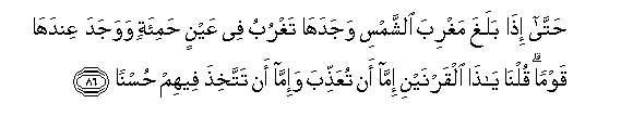 86. Hatta itha balagha maghriba alshshamsi wajadaha taghrubu fee AAaynin hami-atin wawajada AAindaha qawman qulna ya tha alqarnayni imma an tuAAaththiba wa-imma an tattakhitha feehim husnan