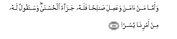 88. Waamma man amana waAAamila salihan falahu jazaan alhusna wasanaqoolu lahu min amrina yusran