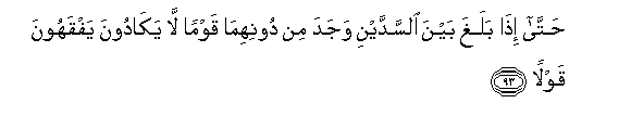 93. Hatta itha balagha bayna alssaddayni wajada min doonihima qawman la yakadoona yafqahoona qawlan