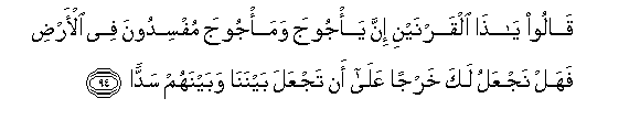 94. Qaloo ya tha alqarnayni inna ya/jooja wama/jooja mufsidoona fee al-ardi fahal najAAalu laka kharjan AAala an tajAAala baynana wabaynahum saddan