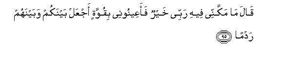 95. Qala ma makkannee feehi rabbee khayrun faaAAeenoonee biquwwatin ajAAal baynakum wabaynahum radman
