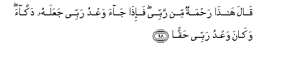 98. Qala hatha rahmatun min rabbee fa-itha jaa waAAdu rabbee jaAAalahu dakkaa wakana waAAdu rabbee haqqan