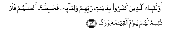 105. Ola-ika allatheena kafaroo bi-ayati rabbihim waliqa-ihi fahabitat aAAmaluhum fala nuqeemu lahum yawma alqiyamati waznan
