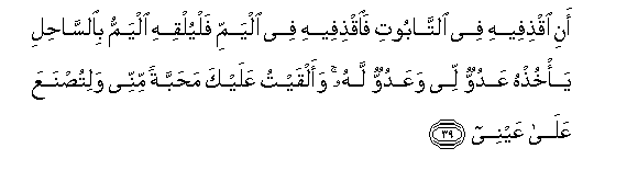 39. Ani iqthifeehi fee alttabooti faiqthifeehi fee alyammi falyulqihi alyammu bialssahili ya/khuthhu AAaduwwun lee waAAaduwwun lahu waalqaytu AAalayka mahabbatan minnee walitusnaAAa AAala AAaynee