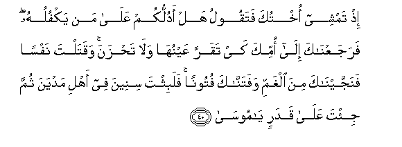 40. Ith tamshee okhtuka fataqoolu hal adullukum AAala man yakfuluhu farajaAAnaka ila ommika kay taqarra AAaynuha wala tahzana waqatalta nafsan fanajjaynaka mina alghammi wafatannaka futoonan falabithta sineena fee ahli madyana thumma ji/ta AAala qadarin ya moosa