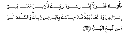 47. Fa/tiyahu faqoola inna rasoola rabbika faarsil maAAana banee isra-eela wala tuAAaththibhum qad ji/naka bi-ayatin min rabbika waalssalamu AAala mani ittabaAAa alhuda