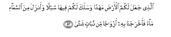 53. Allathee jaAAala lakumu al-arda mahdan wasalaka lakum feeha subulan waanzala mina alssama-i maan faakhrajna bihi azwajan min nabatin shatta