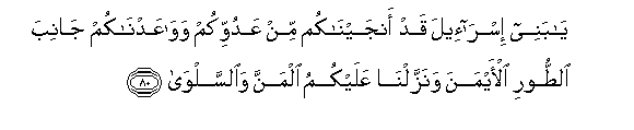 80. Ya banee isra-eela qad anjaynakum min AAaduwwikum wawaAAadnakum janiba alttoori al-aymana wanazzalna AAalaykumu almanna waalssalwa