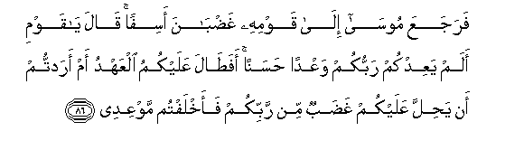 86. FarajaAAa moosa ila qawmihi ghadbana asifan qala ya qawmi alam yaAAidkum rabbukum waAAdan hasanan afatala AAalaykumu alAAahdu am aradtum an yahilla AAalaykum ghadabun min rabbikum faakhlaftum mawAAidee
