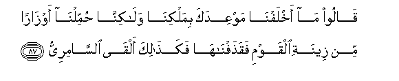 87. Qaloo ma akhlafna mawAAidaka bimalkina walakinna hummilna awzaran min zeenati alqawmi faqathafnaha fakathalika alqa alssamiriyyu