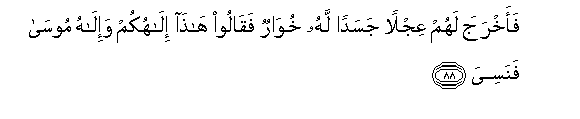 88. Faakhraja lahum AAijlan jasadan lahu khuwarun faqaloo hatha ilahukum wa-ilahu moosa fanasiya