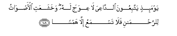 108. Yawma-ithin yattabiAAoona alddaAAiya la AAiwaja lahu wakhashaAAati al-aswatu lilrrahmani fala tasmaAAu illa hamsan