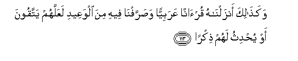 113. Wakathalika anzalnahu qur-anan AAarabiyyan wasarrafna feehi mina alwaAAeedi laAAallahum yattaqoona aw yuhdithu lahum thikran