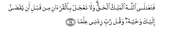114. FataAAala Allahu almaliku alhaqqu wala taAAjal bialqur-ani min qabli an yuqda ilayka wahyuhu waqul rabbi zidnee AAilman