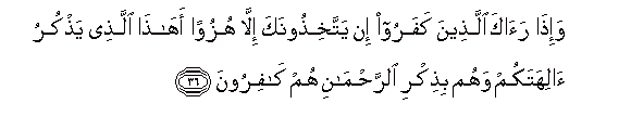 36. Wa-itha raaka allatheena kafaroo in yattakhithoonaka illa huzuwan ahatha allathee yathkuru alihatakum wahum bithikri alrrahmani hum kafiroona