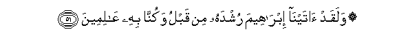 51. Walaqad atayna ibraheema rushdahu min qablu wakunna bihi AAalimeena