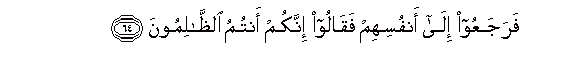 64. So they turned to themselves and said, "Surely ye are the ones in the wrong!"