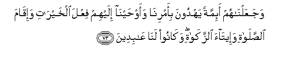 73. WajaAAalnahum a-immatan yahdoona bi-amrina waawhayna ilayhim fiAAla alkhayrati wa-iqama alssalati wa-eetaa alzzakati wakanoo lana AAabideena