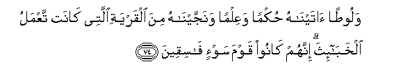 74. Walootan ataynahu hukman waAAilman wanajjaynahu mina alqaryati allatee kanat taAAmalu alkhaba-itha innahum kanoo qawma saw-in fasiqeena
