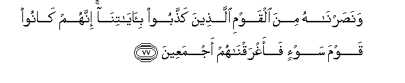 77. Wanasarnahu mina alqawmi allatheena kaththaboo bi-ayatina innahum kanoo qawma saw-in faaghraqnahum ajmaAAeena