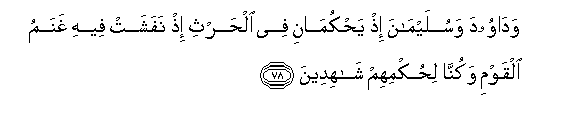78. Wadawooda wasulaymana ith yahkumani fee alharthi ith nafashat feehi ghanamu alqawmi wakunna lihukmihim shahideena