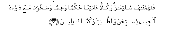 79. Fafahhamnaha sulaymana wakullan atayna hukman waAAilman wasakhkharna maAAa dawooda aljibala yusabbihna waalttayra wakunna faAAileena