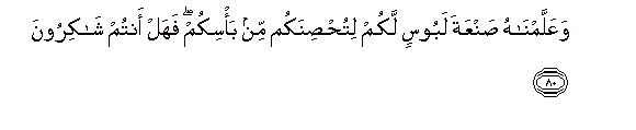 80. WaAAallamnahu sanAAata laboosin lakum lituhsinakum min ba/sikum fahal antum shakiroona