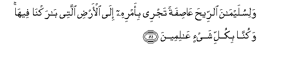 81. (It was Our power that made) the violent (unruly) wind flow (tamely) for Solomon, to his order, to the land which We had blessed: for We do know all things.