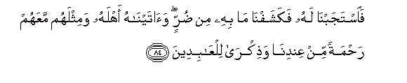 84. Faistajabna lahu fakashafna ma bihi min durrin waataynahu ahlahu wamithlahum maAAahum rahmatan min AAindina wathikra lilAAabideena