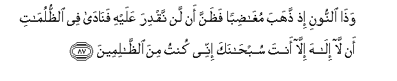 87. Watha alnnooni ith thahaba mughadiban fathanna an lan naqdira AAalayhi fanada fee alththulumati an la ilaha illa anta subhanaka innee kuntu mina alththalimeena