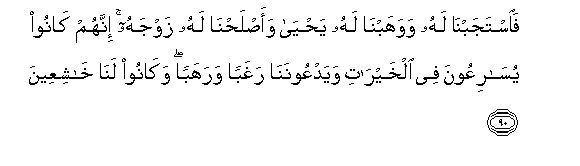 90. Faistajabna lahu wawahabna lahu yahya waaslahna lahu zawjahu innahum kanoo yusariAAoona fee alkhayrati wayadAAoonana raghaban warahaban wakanoo lana khashiAAeena
