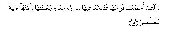 91. Waallatee ahsanat farjaha fanafakhna feeha min roohina wajaAAalnaha waibnaha ayatan lilAAalameena