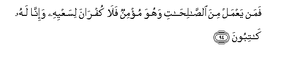 94. Whoever works any act of righteousness and has faith,--His endeavour will not be rejected: We shall record it in his favour.