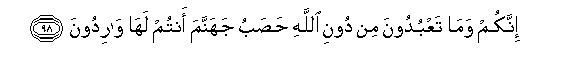 98. Verily ye, (unbelievers), and the (false) gods that ye worship besides Allah, are (but) fuel for Hell! to it will ye (surely) come!