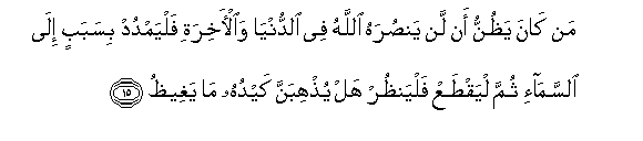 15. Man kana yathunnu an lan yansurahu Allahu fee alddunya waal-akhirati falyamdud bisababin ila alssama-i thumma liyaqtaAA falyanthur hal yuthhibanna kayduhu ma yagheethu