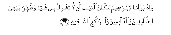 26. Wa-ith bawwa/na li-ibraheema makana albayti an la tushrik bee shay-an watahhir baytiya liltta-ifeena waalqa-imeena waalrrukkaAAi alssujoodi