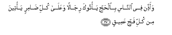 27. "And proclaim the Pilgrimage among men: they will come to thee on foot and (mounted) on every kind of camel, lean on account of journeys through deep and distant mountain highways;