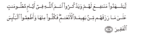 28. Liyashhadoo manafiAAa lahum wayathkuroo isma Allahi fee ayyamin maAAloomatin AAala ma razaqahum min baheemati al-anAAami fakuloo minha waatAAimoo alba-isa alfaqeera