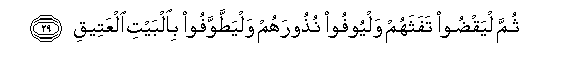 29. Thumma lyaqdoo tafathahum walyoofoo nuthoorahum walyattawwafoo bialbayti alAAateeqi