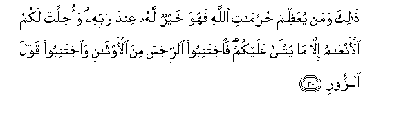 30. Thalika waman yuAAaththim hurumati Allahi fahuwa khayrun lahu AAinda rabbihi waohillat lakumu al-anAAamu illa ma yutla AAalaykum faijtaniboo alrrijsa mina al-awthani waijtaniboo qawla alzzoori