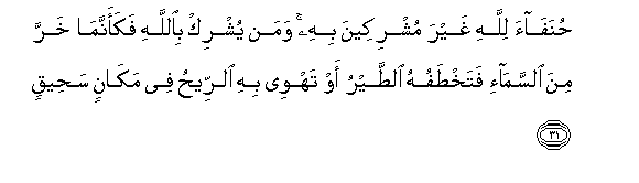 31. Hunafaa lillahi ghayra mushrikeena bihi waman yushrik biAllahi fakaannama kharra mina alssama-i fatakhtafuhu alttayru aw tahwee bihi alrreehu fee makanin saheeqin