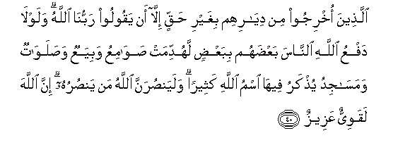 40. Allatheena okhrijoo min diyarihim bighayri haqqin illa an yaqooloo rabbuna Allahu walawla dafAAu Allahi alnnasa baAAdahum bibaAAdin lahuddimat sawamiAAu wabiyaAAun wasalawatun wamasajidu yuthkaru feeha ismu Allahi katheeran walayansuranna Allahu man yansuruhu inna Allaha laqawiyyun AAazeezun