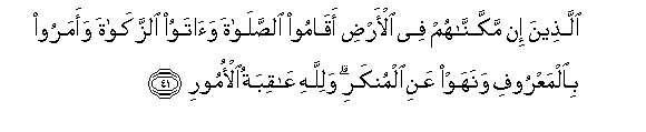 41. Allatheena in makkannahum fee al-ardi aqamoo alssalata waatawoo alzzakata waamaroo bialmaAAroofi wanahaw AAani almunkari walillahi AAaqibatu al-omoori