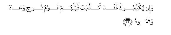 42. Wa-in yukaththibooka faqad kaththabat qablahum qawmu noohin waAAadun wathamoodu