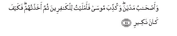 44. Waas-habu madyana wakuththiba moosa faamlaytu lilkafireena thumma akhathtuhum fakayfa kana nakeeri